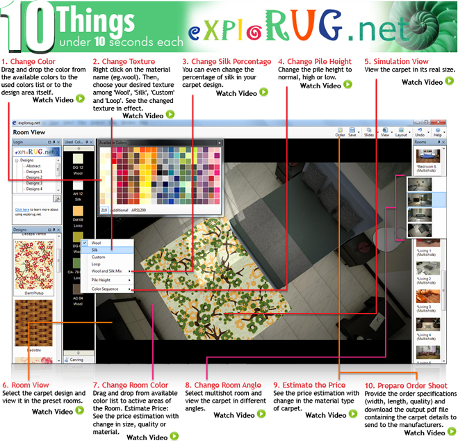 | † exploRUG is an online marketing tool for your custom rug business. It allows users to browse through your collection of designs under different categories and create their own color combinations from among your list of available colors. Users can even customize the material (wool or silk) and weave (pile or loop) and see realistic simulations as a carpet, close up views, or laid out in different rooms. The customized rug can then be ordered online with all the customization information automatically included in the order. The front end of this software can be integrated on your own website. |